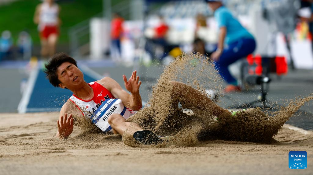 Fujihara Koki of Japan competes during the men's long jump final at the Rhine-Ruhr 2025 FISU World University Games in Bochum, Germany, July 24, 2025. (Xinhua/Hu Xingyu)