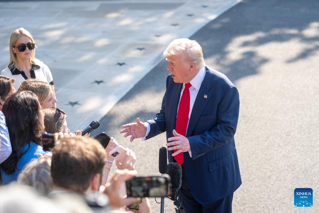 U.S. President Donald Trump speaks to reporters before his departure for the United Kingdom at the White House in Washington, D.C., the United States, on July 25, 2025. (Xinhua/Hu Yousong)