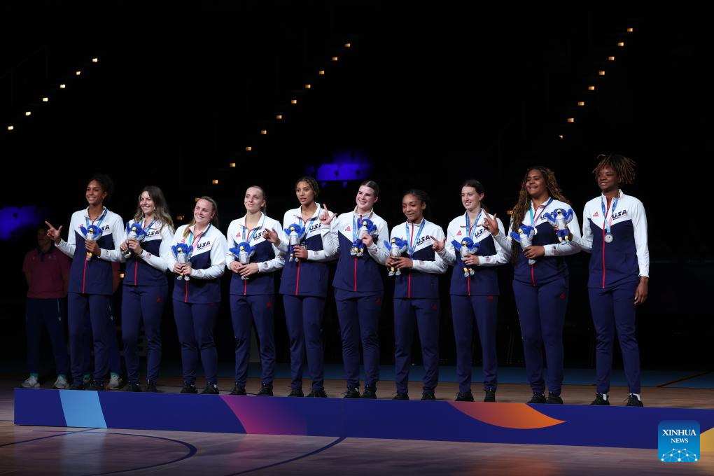 Second-placed, players of the United States, pose for photo during the awarding ceremony of the women's basketball final at the Rhine-Ruhr 2025 FISU World University Games in Essen, Germany, July 25, 2025. (Xinhua/Zhang Fan)