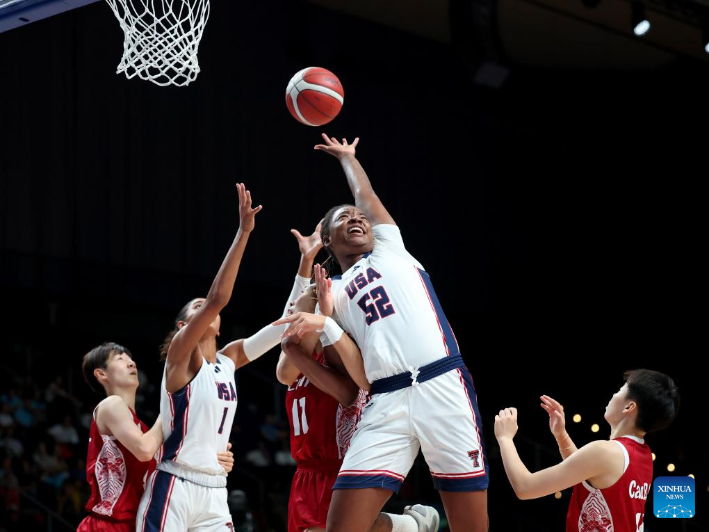 Deyona Mae Gaston (2nd R) of the United States fights for a rebound during the women's basketball final between China and the United States at the Rhine-Ruhr 2025 FISU World University Games in Essen, Germany, July 25, 2025. (Xinhua/Zhang Chen)