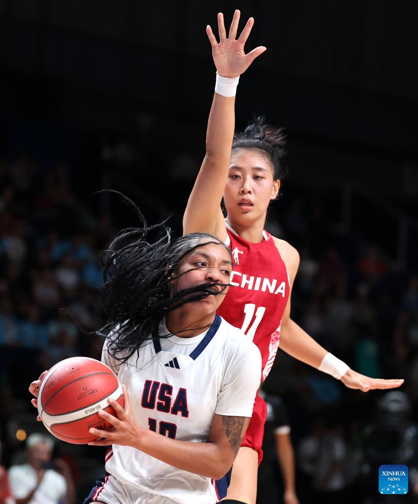 Cao Boyi (Front) of China breaks through during the women's basketball final between China and the United States at the Rhine-Ruhr 2025 FISU World University Games in Essen, Germany, July 25, 2025. (Xinhua/Zhang Chen)