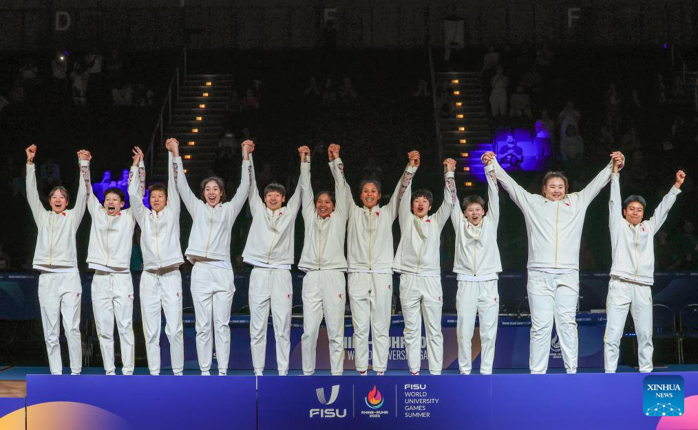 Players of China celebrate after the women's basketball final between China and the United States at the Rhine-Ruhr 2025 FISU World University Games in Essen, Germany, July 25, 2025. (Xinhua/Zhang Fan)