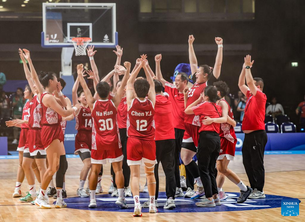 Players of team China celebrate during the women's basketball final between China and the United States at the Rhine-Ruhr 2025 FISU World University Games in Essen, Germany, July 25, 2025. (Xinhua/Zhang Chen)