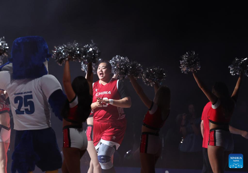 Liu Yutong of China steps into the court ahead of the women's basketball final between China and the United States at the Rhine-Ruhr 2025 FISU World University Games in Essen, Germany, July 25, 2025. (Xinhua/Zhang Chen)
