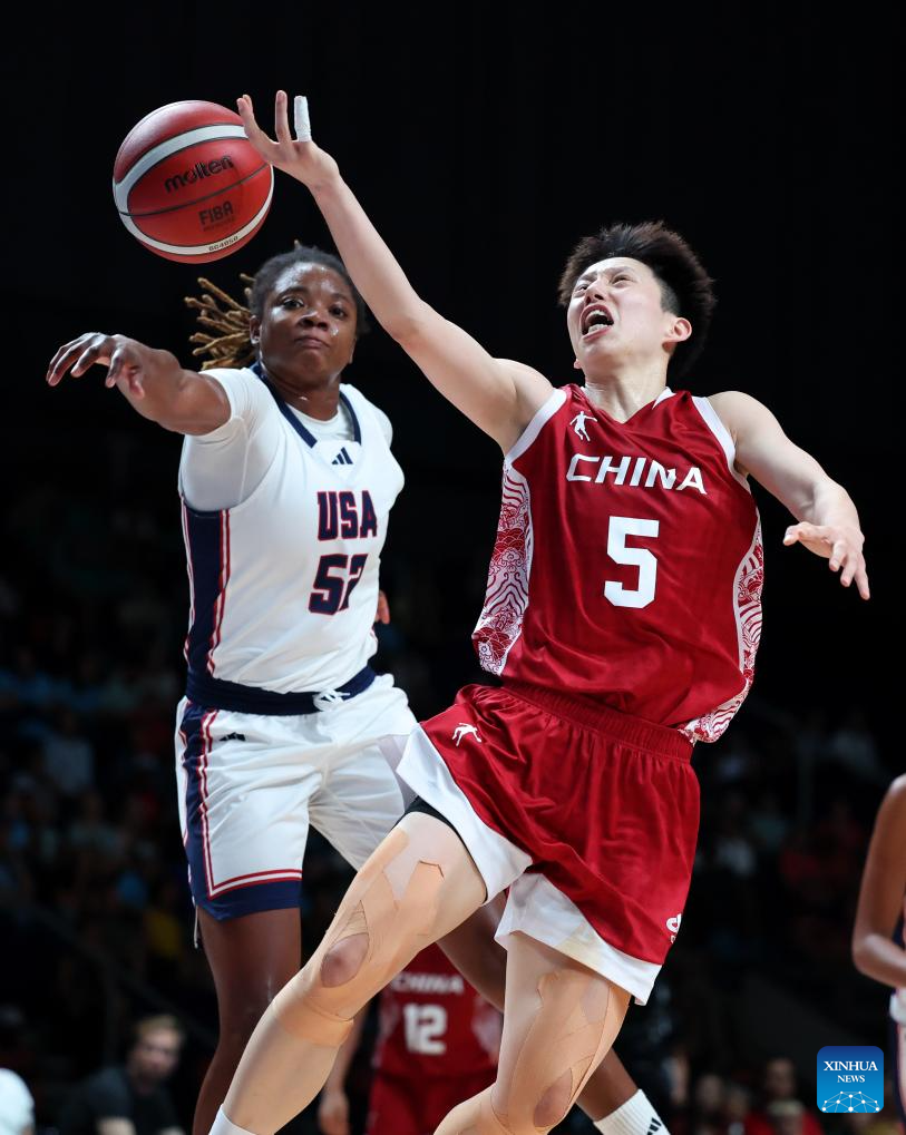 Cao Boyi (L) of China breaks through during the women's basketball final between China and the United States at the Rhine-Ruhr 2025 FISU World University Games in Essen, Germany, July 25, 2025. (Xinhua/Zhang Fan)