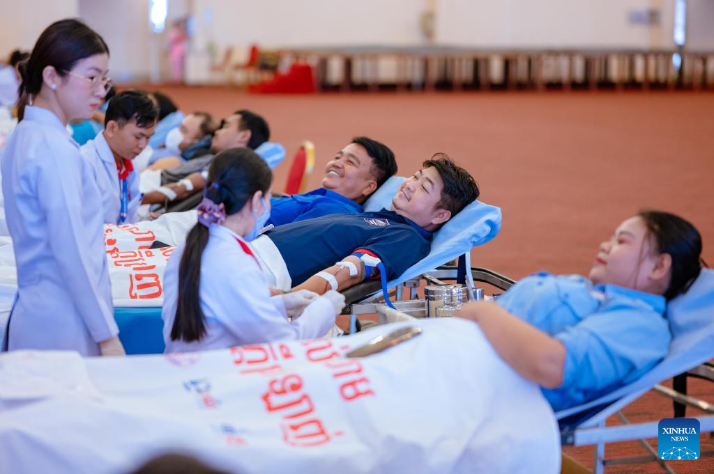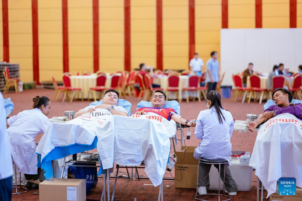 Cambodian people donate blood in Phnom Penh, Cambodia, July 25, 2025. The blood donation was made amid border clashes between Cambodian and Thai soldiers. Cambodia's Oddar Meanchey deputy governor, Met Meas Pheakdey, told Xinhua over the telephone that one villager was killed and five others were wounded on Thursday when the Thai side fired artillery shells into Cambodian territory. Blood donation is organized amid border clashes between Cambodian and Thai soldiers. (Photo by Sovannara/Xinhua)