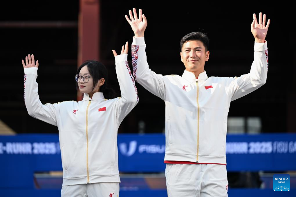 Gold medalists Liu Yanxiu (L) and Wang Yan of China attend the awarding ceremony of the mixed recurve team gold medal match of archery between China and Japan at the Rhine-Ruhr 2025 FISU World University Games in Essen, Germany, July 25, 2025. (Xinhua/Lian Yi)