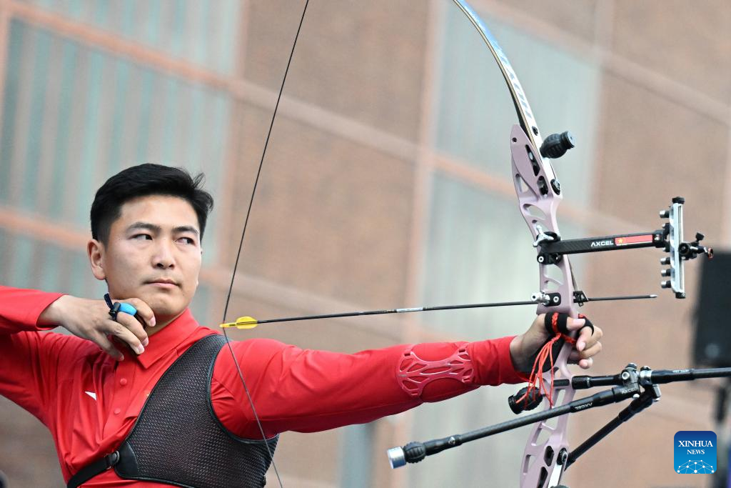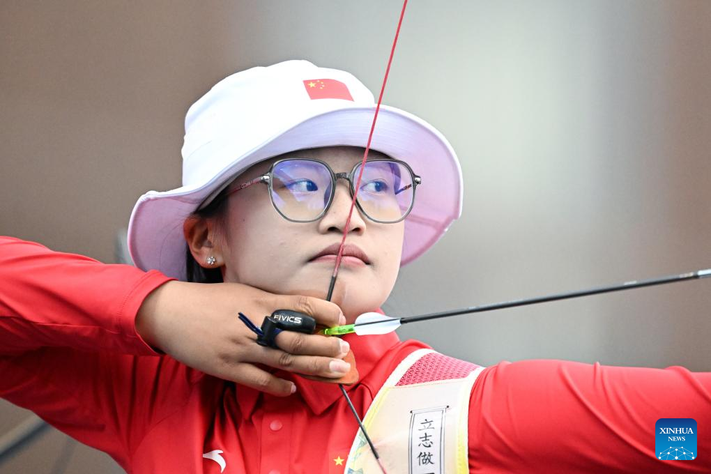 Wang Yan of China competes during the mixed recurve team gold medal match of archery between China and Japan at the Rhine-Ruhr 2025 FISU World University Games in Essen, Germany, July 25, 2025. (Xinhua/Lian Yi)