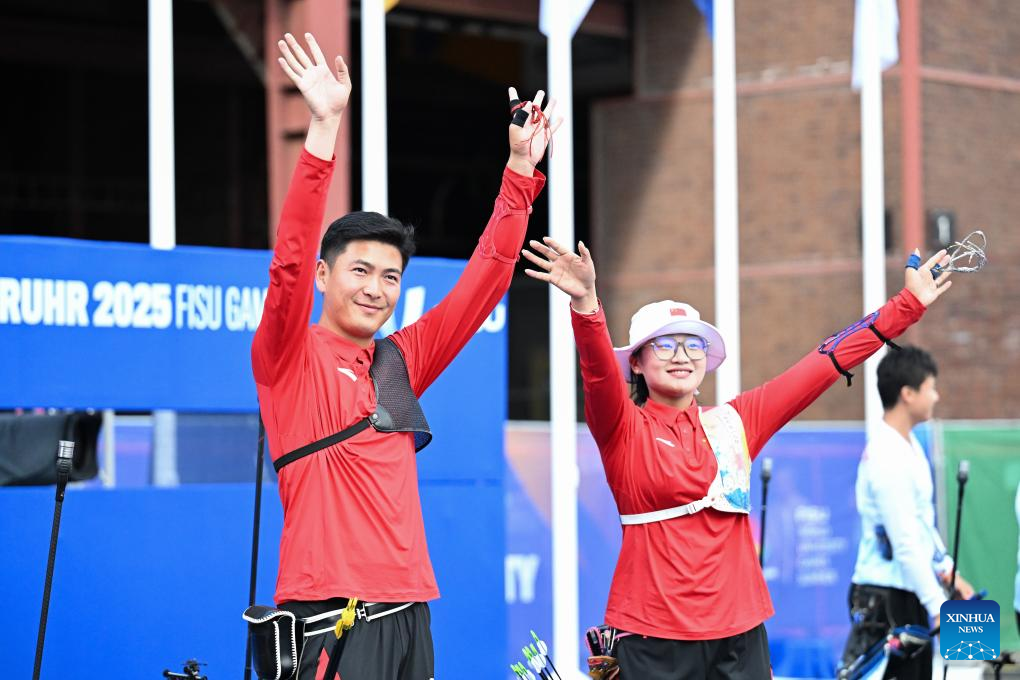 Liu Yanxiu (R) and Wang Yan of China celebrate after the mixed recurve team gold medal match of archery between China and Japan at the Rhine-Ruhr 2025 FISU World University Games in Essen, Germany, July 25, 2025. (Xinhua/Lian Yi)