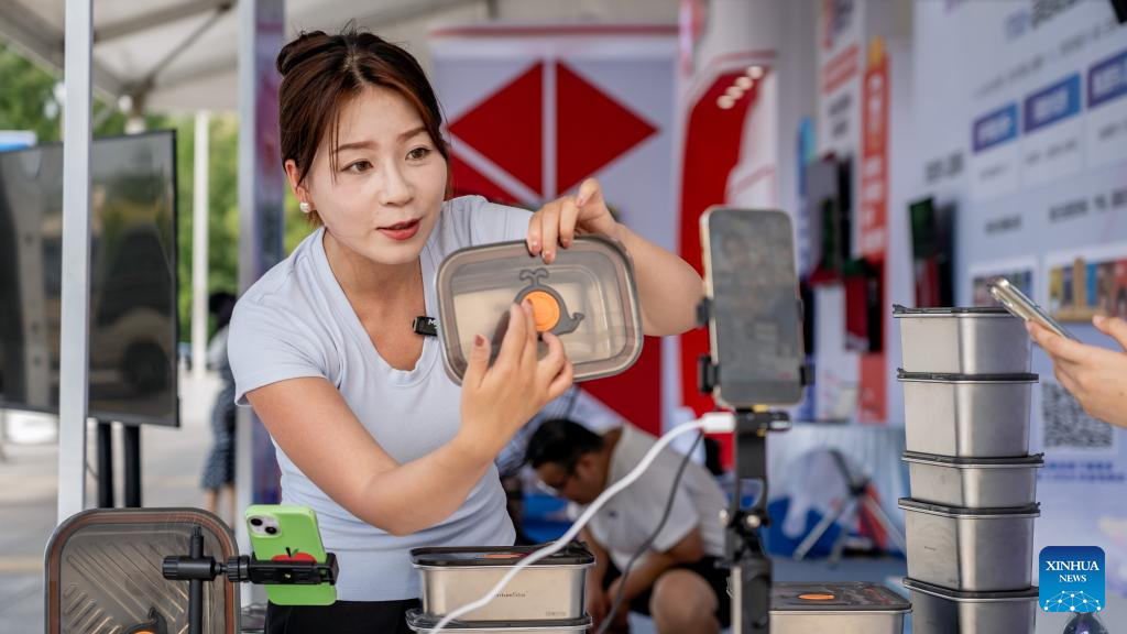 A woman promotes products via live-streaming at the 5th China new e-commerce conference in Yanbian Korean Autonomous Prefecture, northeast China's Jilin Province, July 27, 2025. The event kicked off here on Sunday. (Xinhua/Tang Chengzhuo)