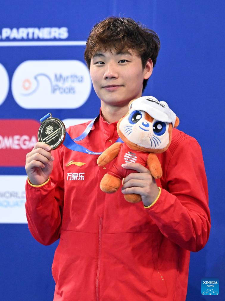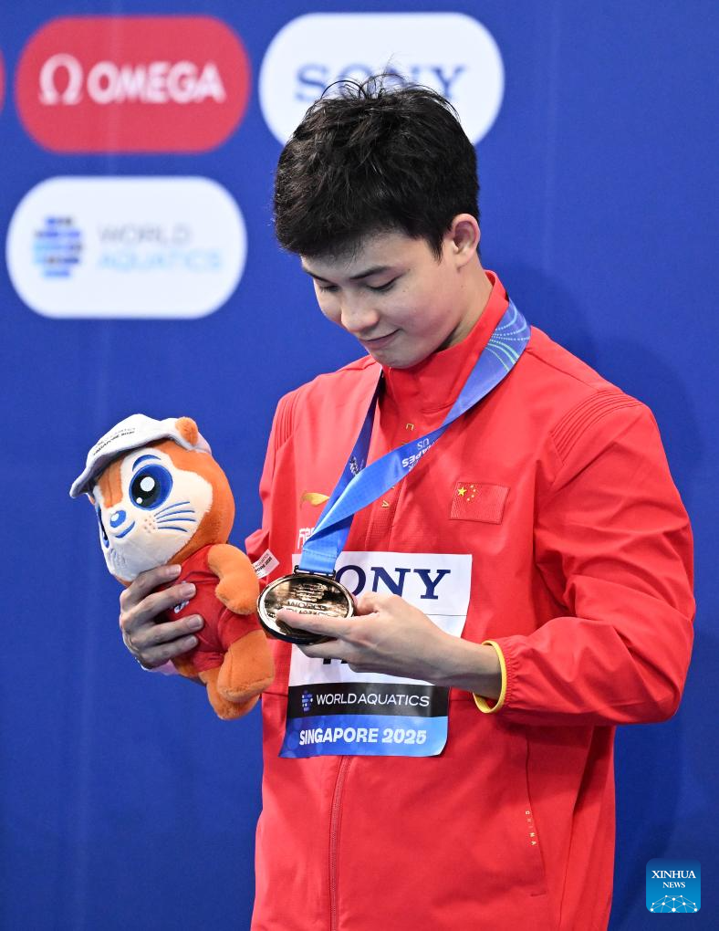Gold medalist Zheng Jiuyuan of China reacts during the awarding ceremony for the men's 1m springboard of diving at the World Aquatics Championships in Singapore, July 27, 2025. (Xinhua/Xue Yuge)