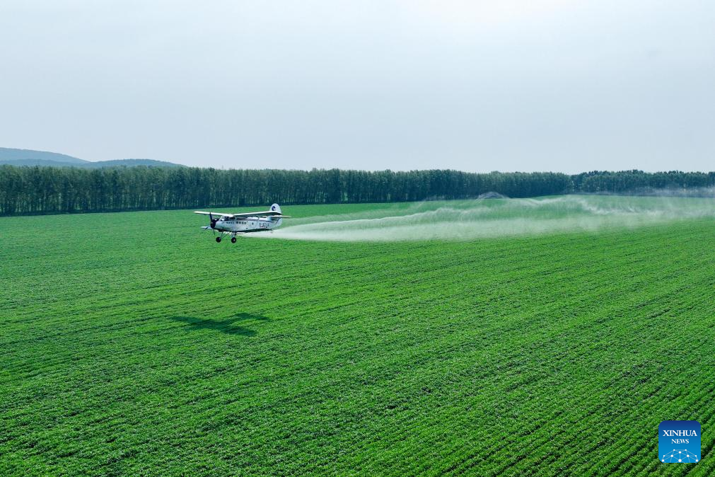 An aerial drone photo taken on July 25, 2025 shows an agricultural aircraft flying above a soybean field at the Beidahuang Group Heilongjiang Hongxing Farm in Bei'an, northeast China's Heilongjiang Province. Aerial crop protection operations have commenced across various agricultural production units of the Beidahuang Group, covering more than 30 million mu (about 2 million hectares) of dry farmlands. (Photo by Hou Yue/Xinhua)