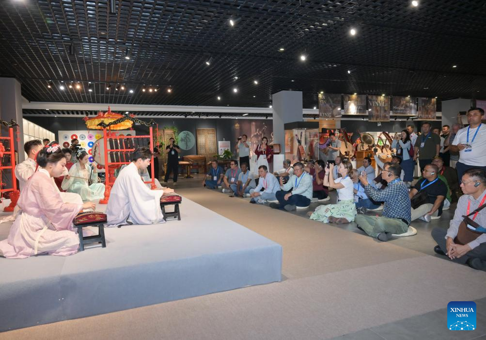 Participants of the Shanghai Cooperation Organization (SCO) Media and Think Tank Summit watch a performance of traditional Chinese musical instruments in Kaifeng, central China's Henan Province, July 26, 2025. The SCO Media and Think Tank Summit is held in Zhengzhou from July 23 to 27. Participants are invited to visit various locations in Henan during the summit. (Xinhua/Gao Jie)