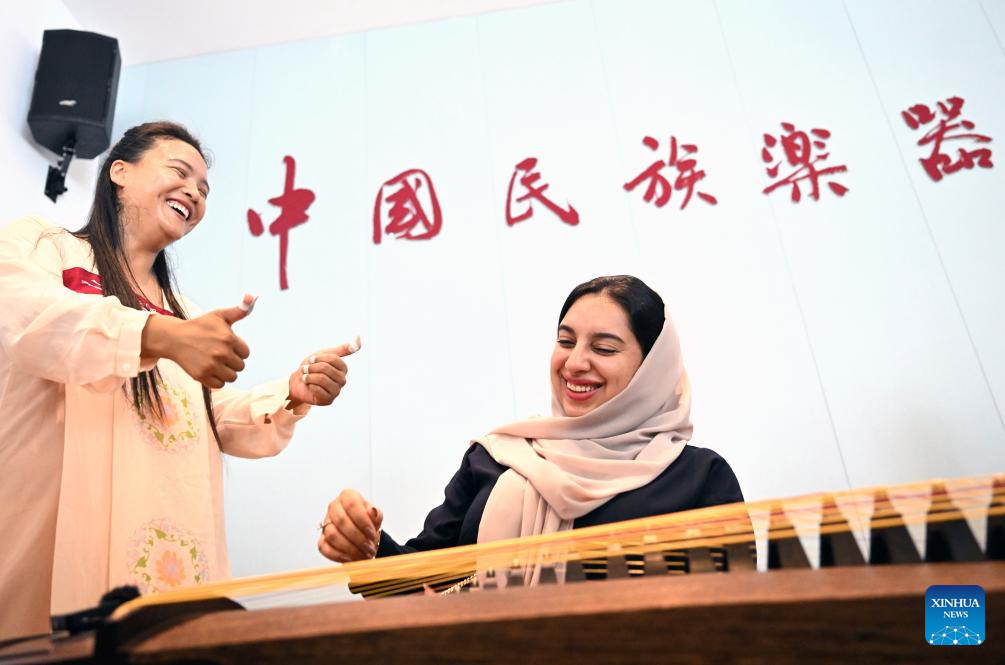 A participant of the Shanghai Cooperation Organization (SCO) Media and Think Tank Summit tries traditional Chinese musical instrument, in Lankao County, central China's Henan Province, July 26, 2025. The SCO Media and Think Tank Summit is held in Zhengzhou from July 23 to 27. Participants are invited to visit various locations in Henan during the summit. (Xinhua/Li Jianan)