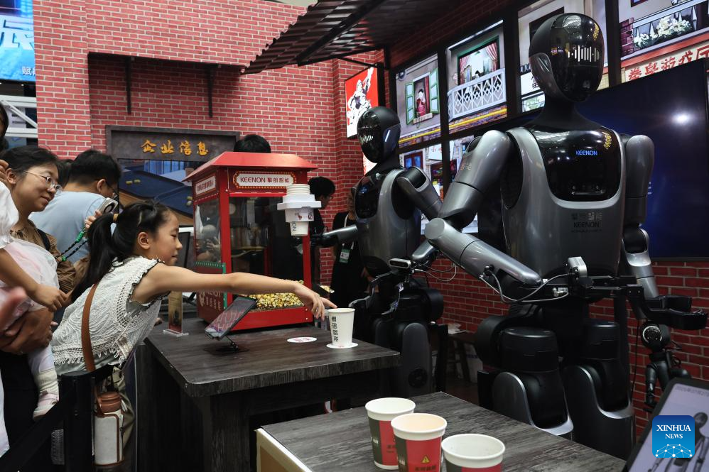 Humanoid robots serve popcorn and beverage at the 2025 World AI Conference in east China's Shanghai, July 27, 2025.