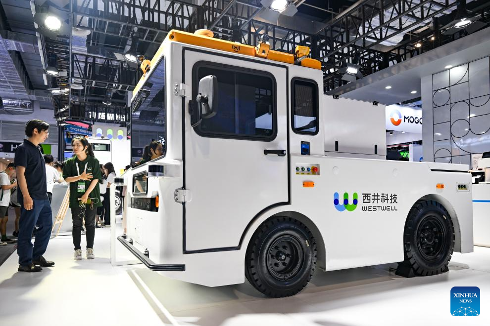 A staff member (R) of Westwell, a Chinese technology company, introduces a Q-Tractor P40 Plus new energy unmanned vehicle to a visitor during its debut at the 2025 World AI Conference in east China's Shanghai, July 27, 2025. The ongoing 2025 World AI Conference showcases the world's latest AI advancements while providing a platform for visitors to access AI products and technologies. (Xinhua/Chen Haoming)