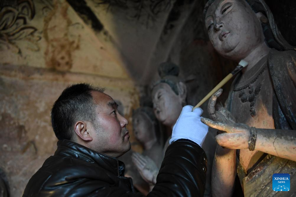 Mu Changyou, a cultural relics restorer of Maiji Mountain Grottoes art institute, performs restoration work of a statue at a cave of the Grottoes in Tianshui City, northwest China's Gansu Province on Dec. 25, 2019. Mu Changyou, 59, has worked on relics restoration for four decades at Maiji Mountain Grottoes, one of the four most famous grottoes in China. Starting as an apprentice, Mu had spent more than 10 years doing chores like cleaning caves, arranging tools, mixing mud and twisting hemp ropes etc. Thanks to constant interactions with and guidance by weathered masters in this walk of life, along with diligence in reading of professional books and hands-on practice, Mu eventually turned himself from a farmer to a senior cultural relics restorer.
