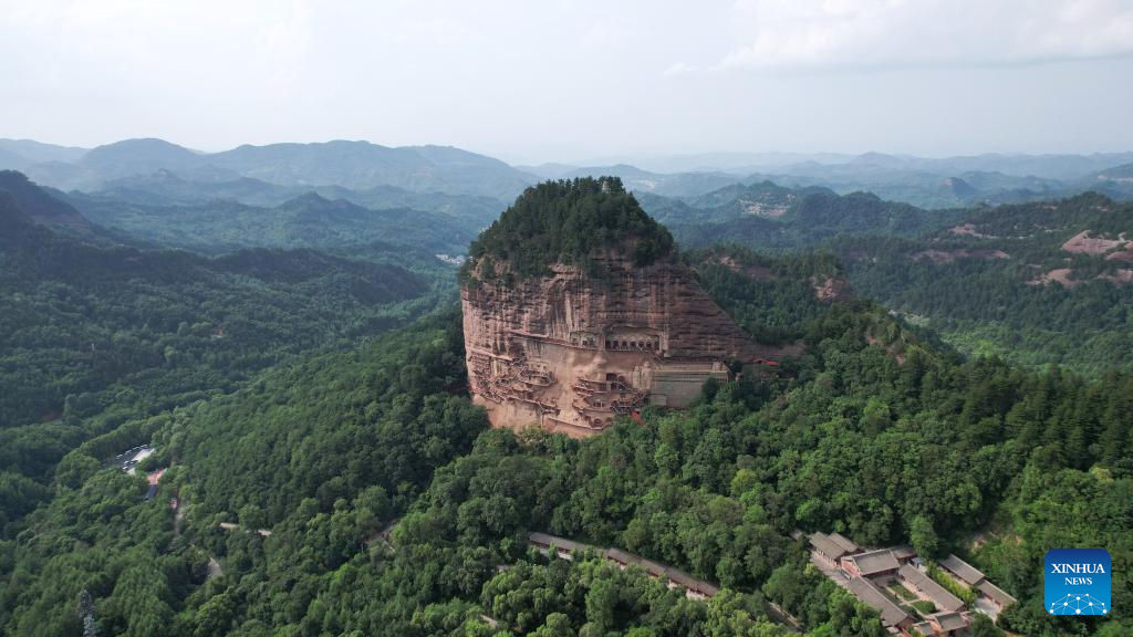 A drone photo taken on July 16, 2025 shows a view of the Maiji Mountain Grottoes in Tianshui City, northwest China's Gansu Province. (Xinhua/Chen Bin)
