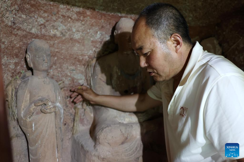 Mu Changyou, a cultural relics restorer of Maiji Mountain Grottoes art institute, checks a statue he restored at the Grottoes in Tianshui City, northwest China's Gansu Province on July 16, 2025. (Xinhua/Chen Bin)