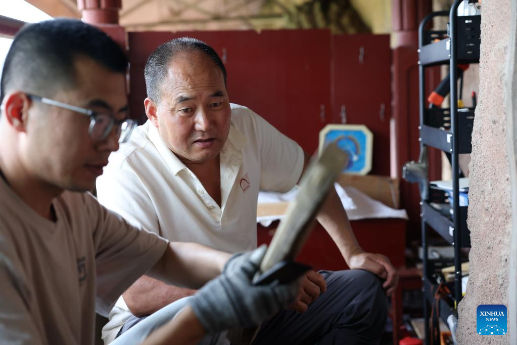 Mu Changyou (R), a cultural relics restorer of Maiji Mountain Grottoes art institute, guides his apprentice at a cave of the Grottoes in Tianshui City, northwest China's Gansu Province on July 16, 2025. (Xinhua/Chen Bin)