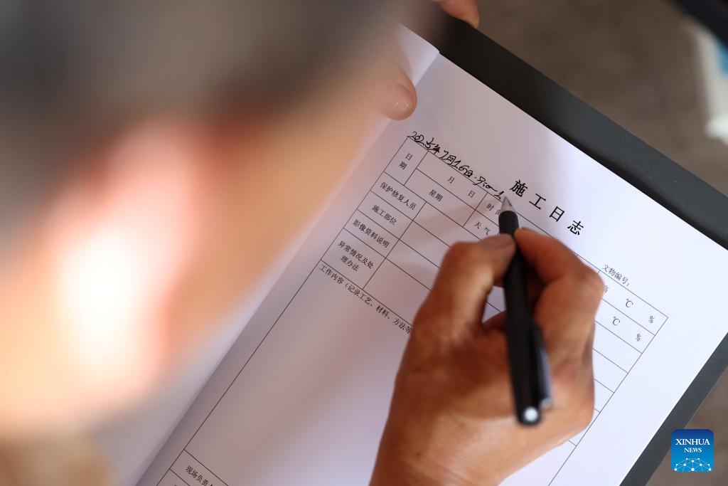Mu Changyou, a cultural relics restorer of Maiji Mountain Grottoes art institute, fills out a logbook for restoration work at a cave of the Grottoes in Tianshui City, northwest China's Gansu Province on July 16, 2025. (Xinhua/Chen Bin)