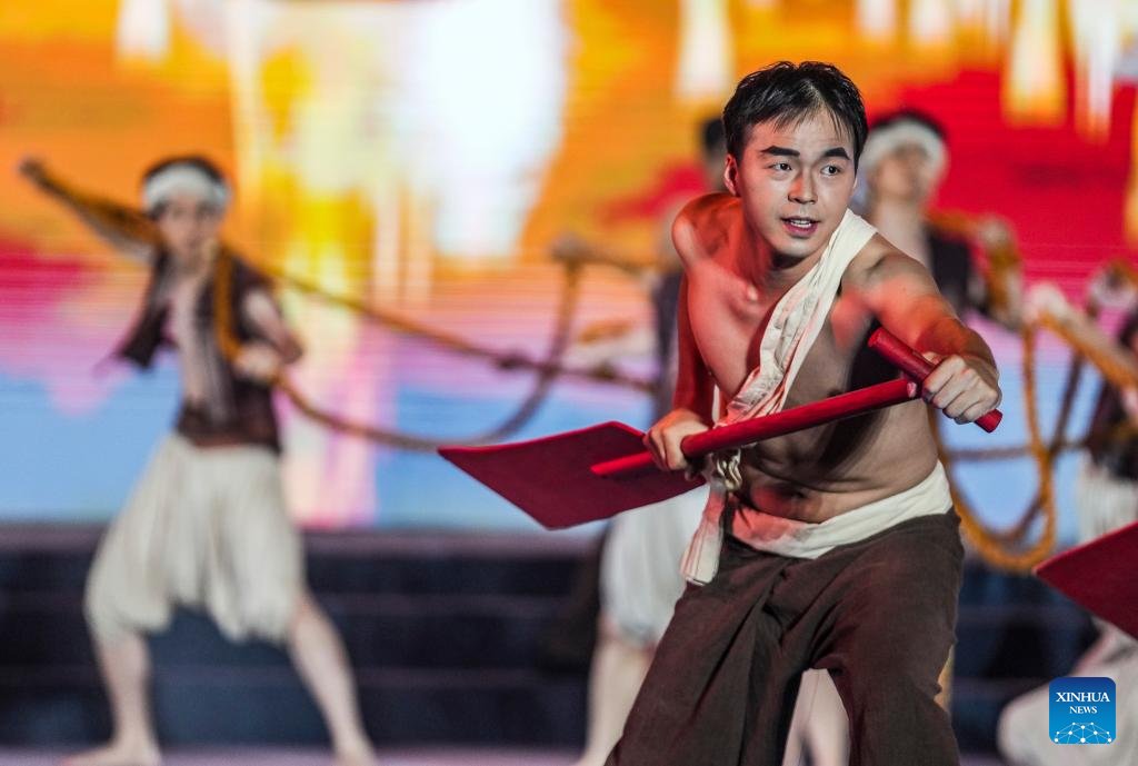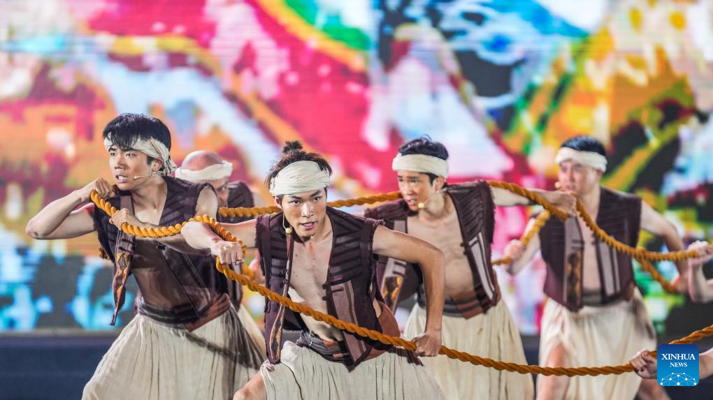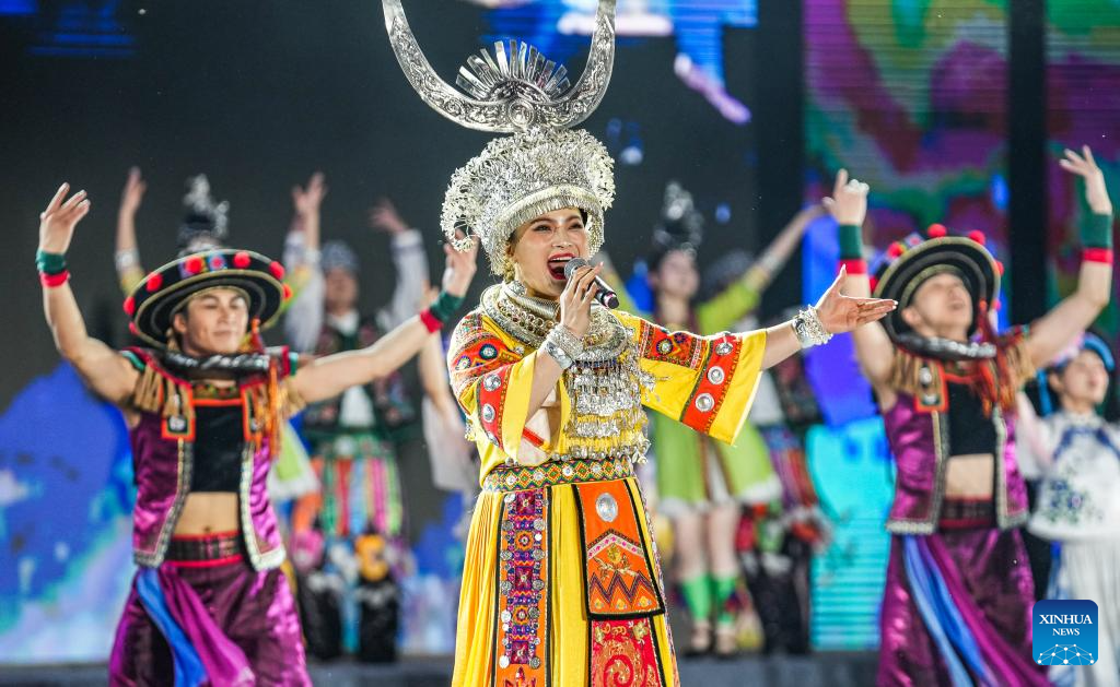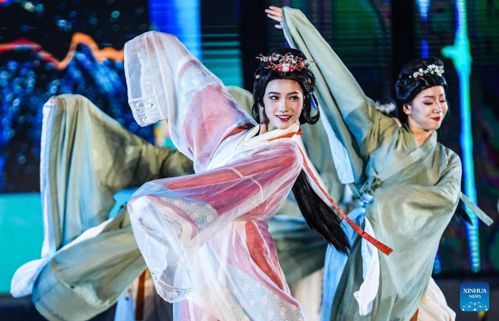 Artists are pictured during a performance for international culture and art exchange as part of the 2025 China-ASEAN Education Cooperation Week in Gui'an New Area, southwest China's Guizhou Province, July 25, 2025. The performance was staged here on Friday, aiming to drive for in-depth integration among sectors of education, sports, culture and tourism. (Xinhua/Tao Liang)