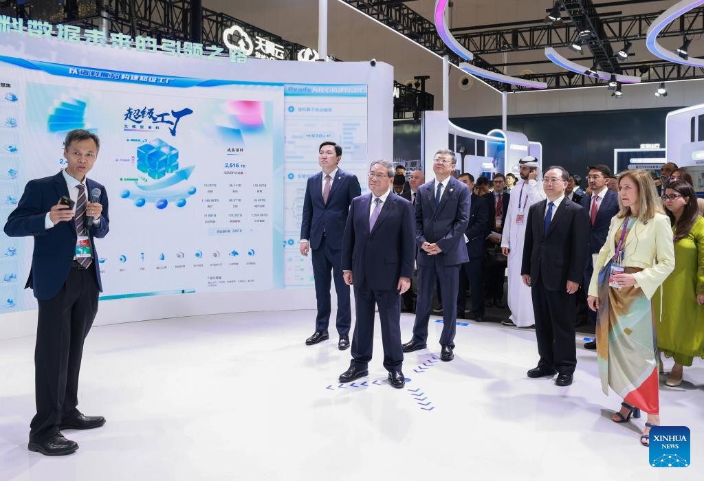 Chinese Premier Li Qiang, together with foreign guests and representatives from international organizations, tours the venue after the opening ceremony of the 2025 World AI Conference and High-Level Meeting on Global AI Governance in Shanghai, east China, July 26, 2025. Li on Saturday attended and addressed the opening ceremony of the 2025 World AI Conference and High-Level Meeting on Global AI Governance. (Xinhua/Wang Ye)