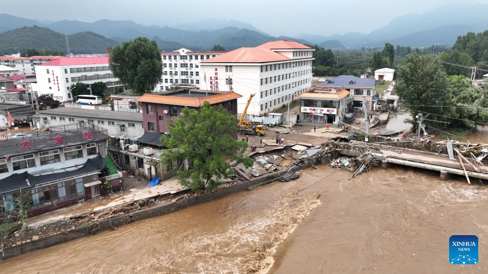 An aerial drone photo taken on July 28, 2025 shows a road and a bridge affected by flood at Xiaying Village of Xiaying Town, Jizhou District of north China's Tianjin. Houses, bridges and power lines at part of villages in Jizhou District were damaged by floods inflicted by recent heavy rainfall and upstream runoff.
