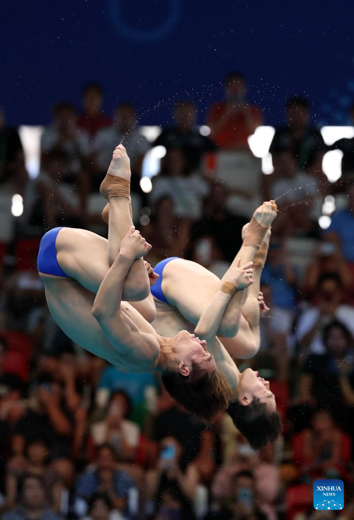 Wang Zongyuan/Zheng Jiuyuan of China compete during the men's 3m synchronised final of diving at the World Aquatics Championships in Singapore, July 28, 2025. (Xinhua/Luo Yuan)
