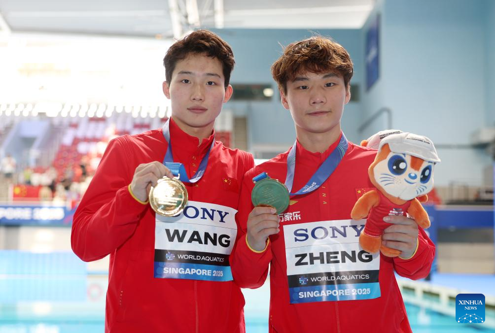 Wang Zongyuan/Zheng Jiuyuan (R) of China pose after the awarding ceremony for the men's 3m synchronised final of diving at the World Aquatics Championships in Singapore, July 28, 2025. (Xinhua/Luo Yuan)