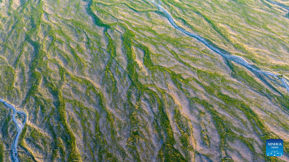An aerial drone photo taken on July 29, 2025 shows lush grass and trees at the foot of the Helan Mountain in northwest China's Ningxia Hui Autonomous Region. (Xinhua/Wang Peng)