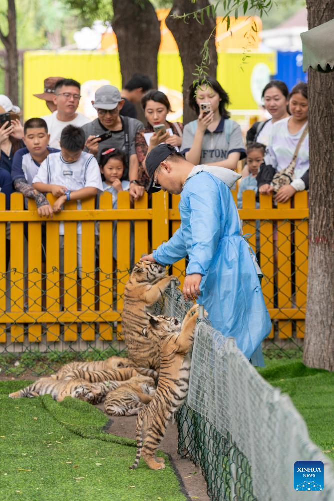 A breeder interacts with tiger cubs at the Siberian Tiger Park in Harbin, northeast China's Heilongjiang Province, July 29, 2025. A series of events, which marks the International Tiger Day, was held here on Tuesday. (Xinhua/Xie Jianfei)
