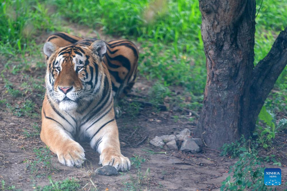 A tiger rests under a tree at the Siberian Tiger Park in Harbin, northeast China's Heilongjiang Province, July 29, 2025. A series of events, which marks the International Tiger Day, was held here on Tuesday. (Xinhua/Xie Jianfei)