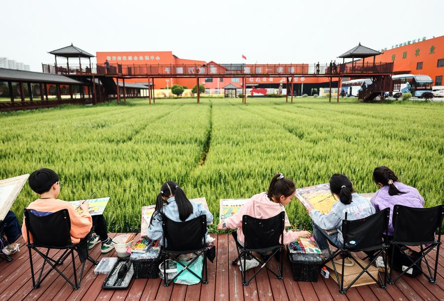 Children draw pictures beside the fields at Yuxin Town of Nanhu District in Jiaxing City, east China's Zhejiang Province, April 27, 2024. (Xinhua/Lan Hongguang)