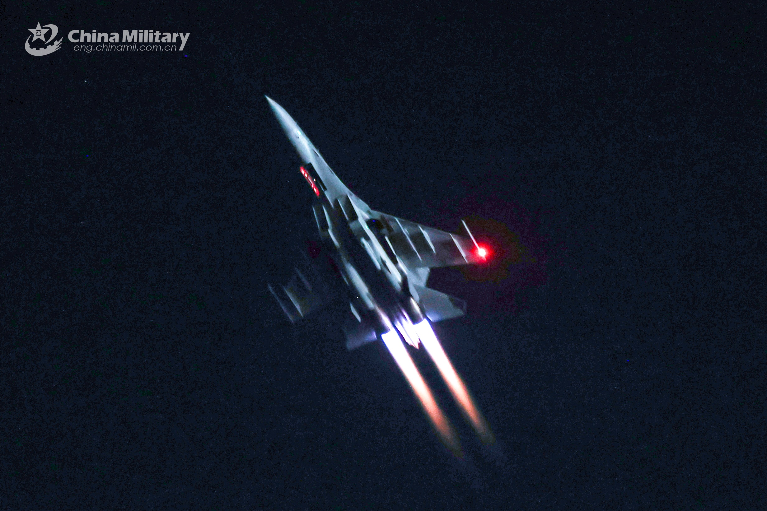 A J-16 fighter jet attached to an aviation brigade with the air force under the Chinese PLA Eastern Theater Command soars into the sky during a nighttime flight training exercise in early July, 2025. (eng.chinamil.com.cn/Photo by Zheng Hanyi)