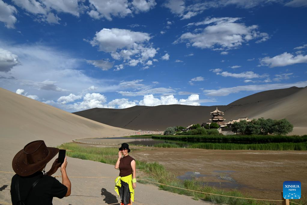 Tourists visit the Mingsha Mountain and Crescent Spring scenic spot in Dunhuang City, northwest China's Gansu Province, May 31, 2025. Crescent Spring, a famed desert oasis in northwest China's Gansu Province, has recorded its highest water level and largest surface area in over 20 years, signaling a major victory in ecological restoration efforts. (Photo by Zhang Xiaoliang/Xinhua)