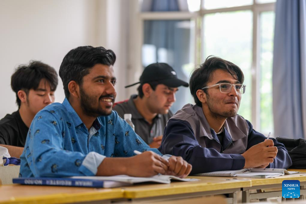 Muhammad Mohsin (1st L) attends a lecture at Tianjin International Chinese College in north China's Tianjin, July 17, 2025. (Xinhua/Sun Fanyue)