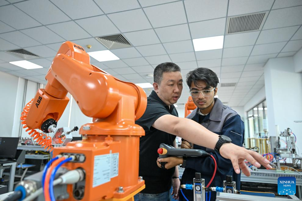 Muhammad Mohsin (R) learns to operate automated equipment at Tianjin Modern Vocational Technology College in north China's Tianjin, June 16, 2025. (Xinhua/Sun Fanyue)