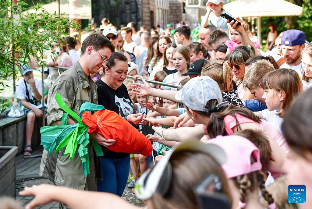People make a gift for giant panda Ru Yi at the Moscow Zoo in Moscow, Russia on July 31, 2025. The Moscow Zoo held an event to celebrate giant panda Ru Yi's birthday on Thursday. (Xinhua/Zhang Chaoqun)
