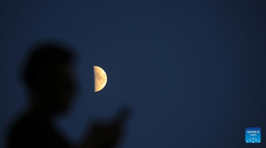 This photo taken on Aug. 1, 2025 shows the first quarter moon in the sky in Qionghai City, south China's Hainan Province. (Photo by Meng Zhongde/Xinhua)