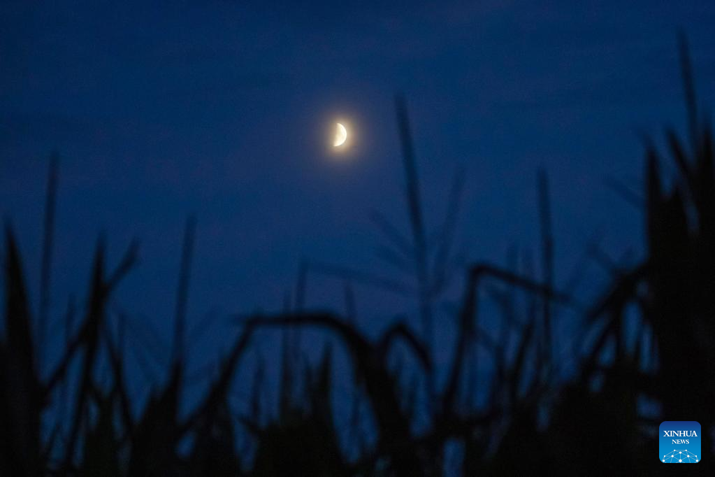 This photo taken on Aug. 1, 2025 shows the first quarter moon in the sky in Jiamusi City, northeast China's Heilongjiang Province. (Photo by Zhu Zongqiang/Xinhua)