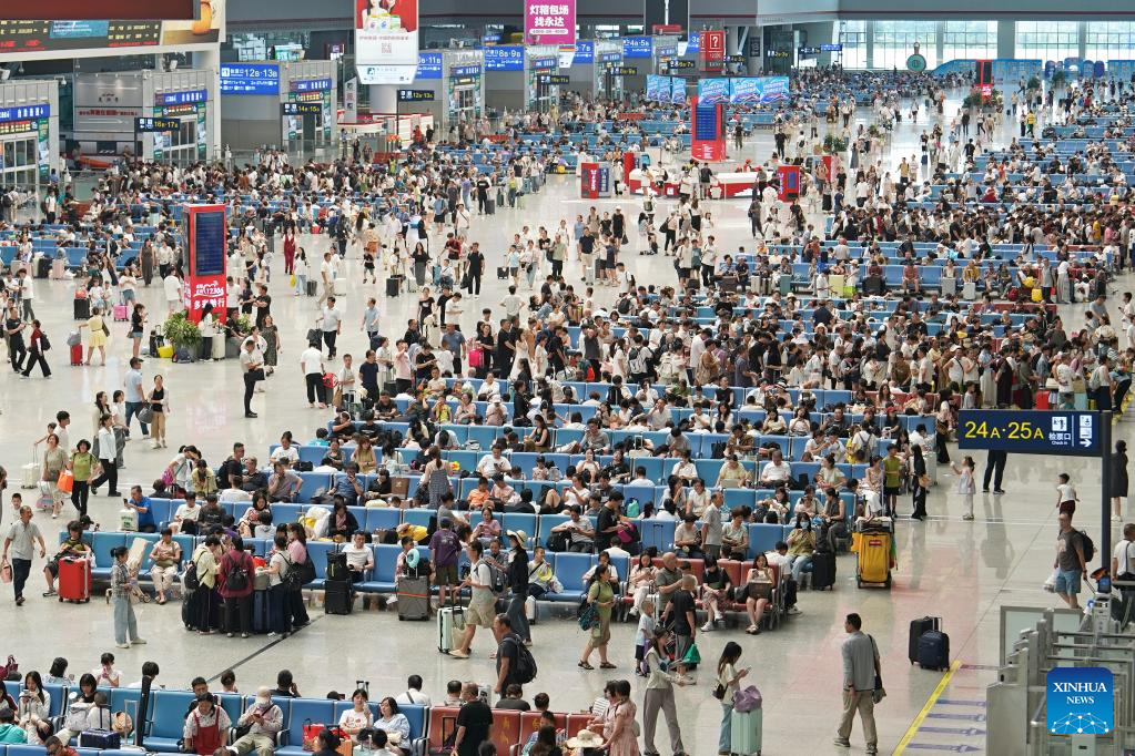 This photo taken on Aug. 1, 2025 shows passengers waiting for trains at Guiyang North Railway Station in Guiyang, southwest China's Guizhou Province. This year's summer travel rush will last for 62 days from July 1 to Aug. 31. From July 1 to 31, the country's railways had handled 441 million passenger trips with an increase of 4.3 percent year-on-year, and the daily average number of passenger trips was 14.213 million, according to China State Railway Group Co., Ltd.
