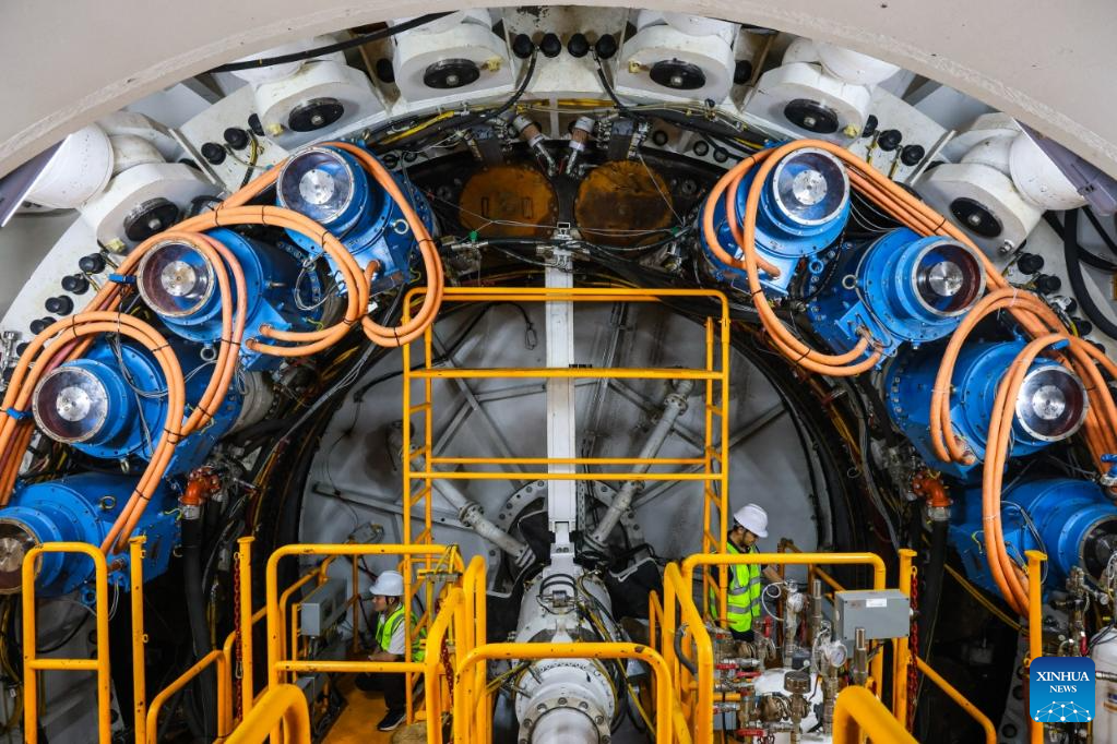 Technicians check a tunnel boring machine (TBM) at the construction site of a tunnel in Pingshan, Shenzhen City, south China's Guangdong Province, Aug. 1, 2025. A giant tunnel boring machine started operation on Friday to spearhead the excavation works for a tunnel along a railway linking Shenzhen and Shanwei special cooperation zone in Shenzhen.