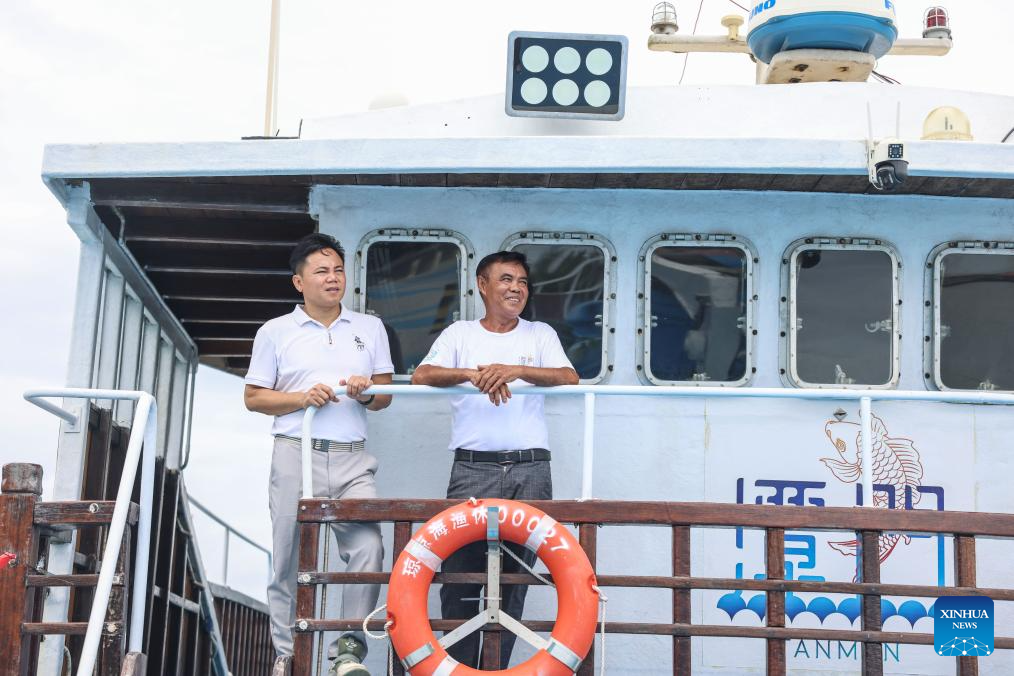 Wang Zhenzhong (L) and Wang Shubao stand on a boat at Tanmen Port in Qionghai, south China's Hainan Province, July 22, 2025. (Xinhua/Zhang Liyun)