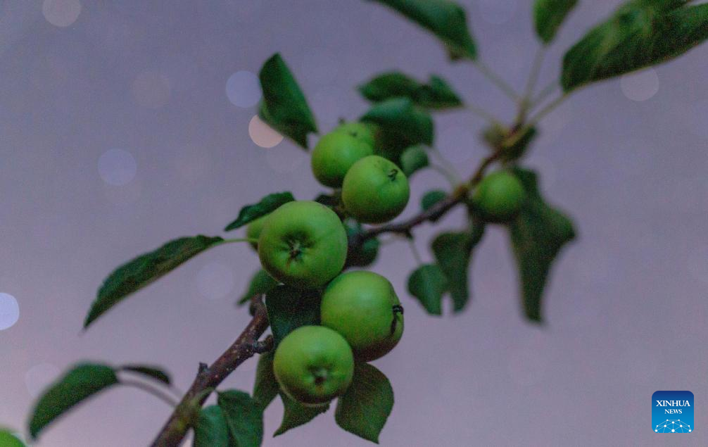 This photo taken on July 25, 2025 shows apples under the starry sky in Tangyuan County of Jiamusi City, northeast China's Heilongjiang Province. Heilongjiang Province, a major agricultural producer dubbed "China's grain barn," have seen its crops enter the ripening stage recently. (Photo by Chen Zhiguo/Xinhua)