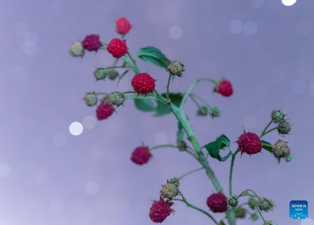 This photo taken on July 26, 2025 shows raspberries under the starry sky on the outskirt of Jiamusi City, northeast China's Heilongjiang Province. Heilongjiang Province, a major agricultural producer dubbed "China's grain barn," have seen its crops enter the ripening stage recently. (Photo by Chen Zhiguo/Xinhua)