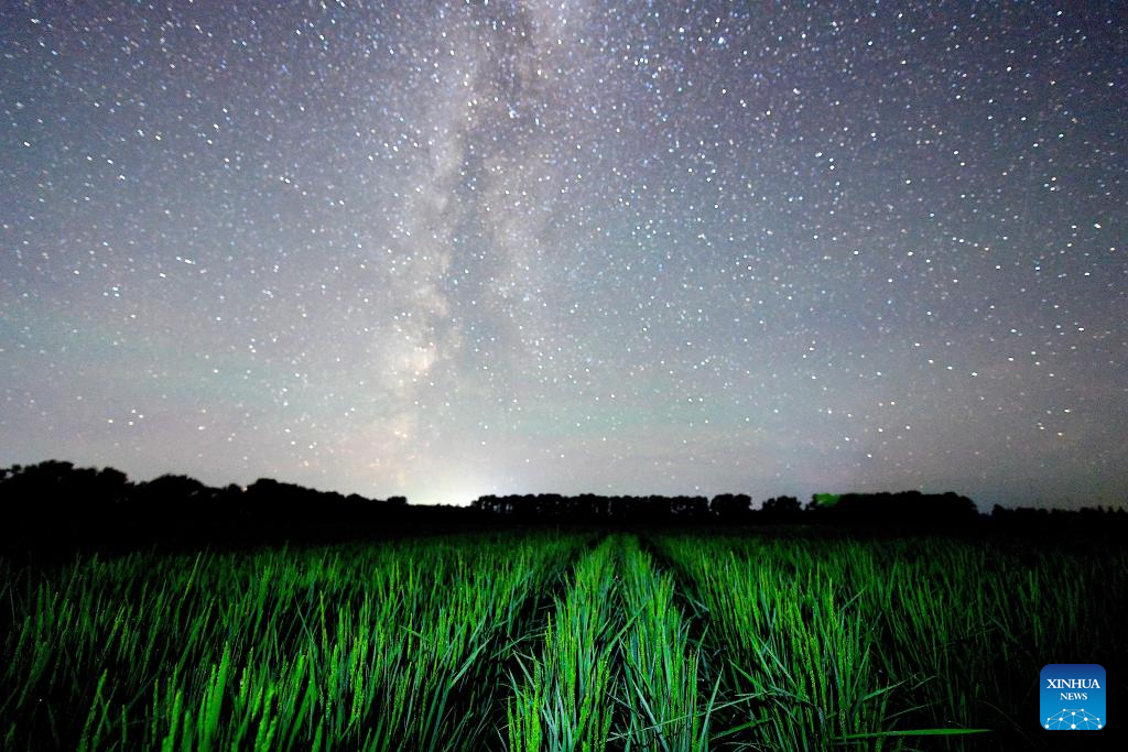 This photo taken on July 25, 2025 shows a paddy field under the starry sky in Yanshan Town of Fujin City, northeast China's Heilongjiang Province. Heilongjiang Province, a major agricultural producer dubbed "China's grain barn," have seen its crops enter the ripening stage recently. (Photo by Qu Yubao/Xinhua)