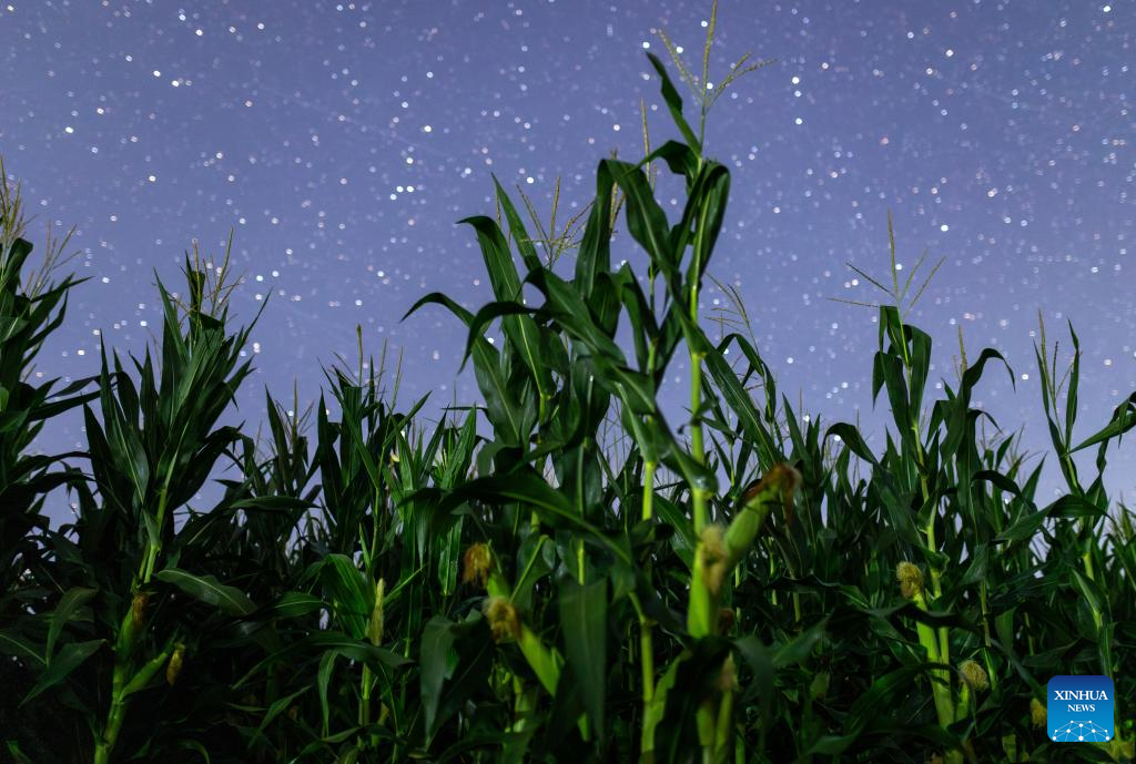 This photo taken on Aug. 2, 2025 shows corns under the starry sky in Tangyuan County of Jiamusi City, northeast China's Heilongjiang Province. Heilongjiang Province, a major agricultural producer dubbed "China's grain barn," have seen its crops enter the ripening stage recently. (Photo by Chen Zhiguo/Xinhua)