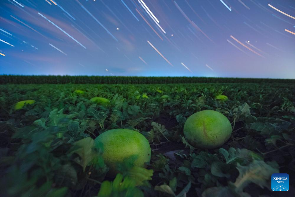 This photo taken on July 23, 2025 shows watermelons in a field under the starry sky in Shangjieji Town of Fujin City, northeast China's Heilongjiang Province. Heilongjiang Province, a major agricultural producer dubbed "China's grain barn," have seen its crops enter the ripening stage recently. (Photo by Qu Yubao/Xinhua)