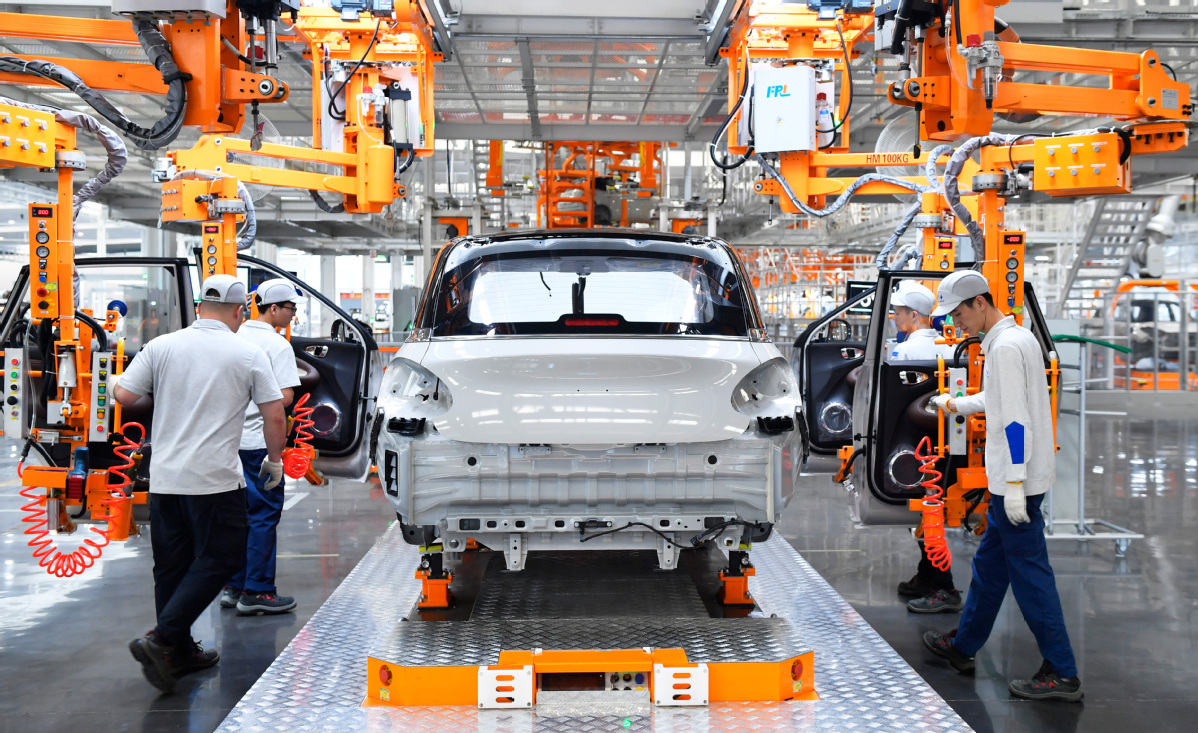 Workers operate at a production line of SAIC-GM-Wuling in Liuzhou, Guangxi Zhuang autonomous region, in May. [Photo/Xinhua]